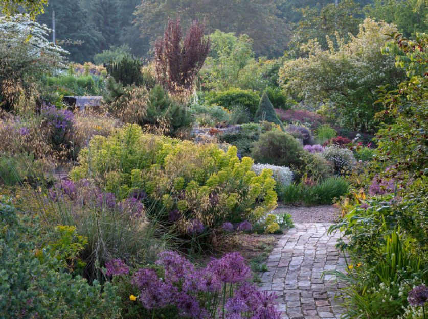 Rockery and Dry Garden: Textural combinations and unique plant forms, showcasing Bernard’s focus on structure over colour due to his colour blindness.